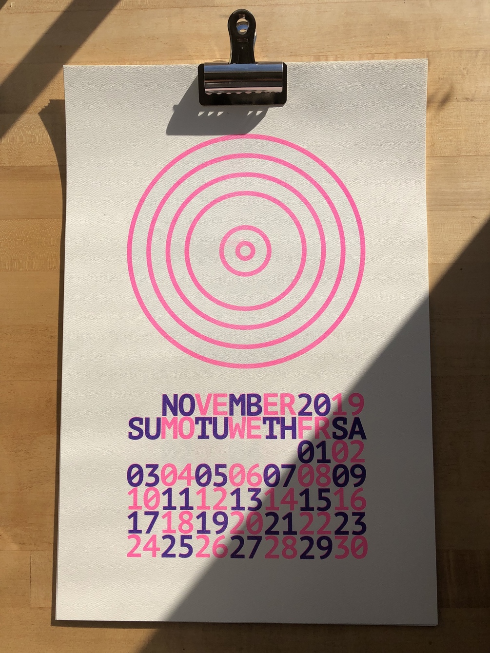 Each month has a different variation on minimalist rings and circles. They're printed on 12x18, 80lb textured ivory paper in fluorescent pink and medium blue. The overlap of the two colors looks kind of purple. I'll include a bulldog clip with each purchase.