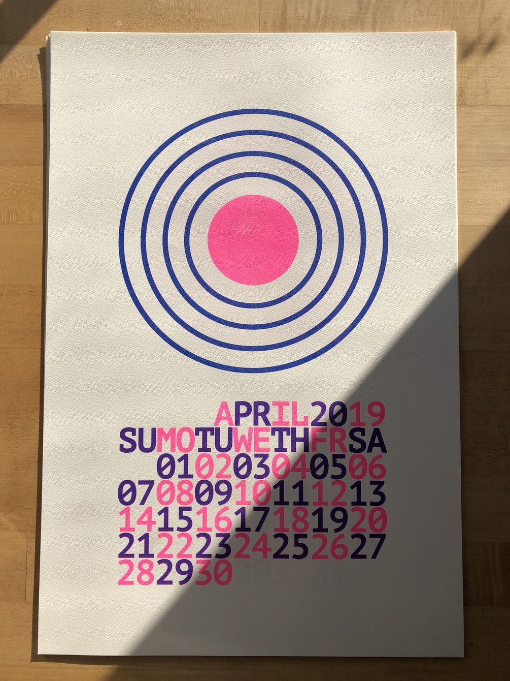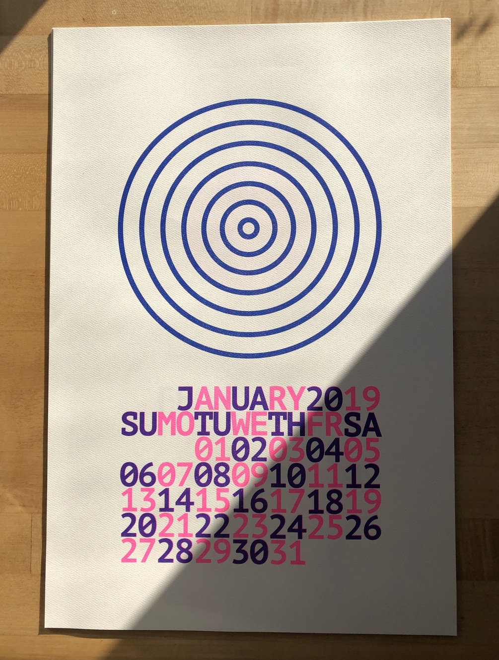 Thanks for your interest in the 2019 Risograph Calendar! I'm accepting pre-orders for these big babies, and will ship by December 17th (or sooner.)
